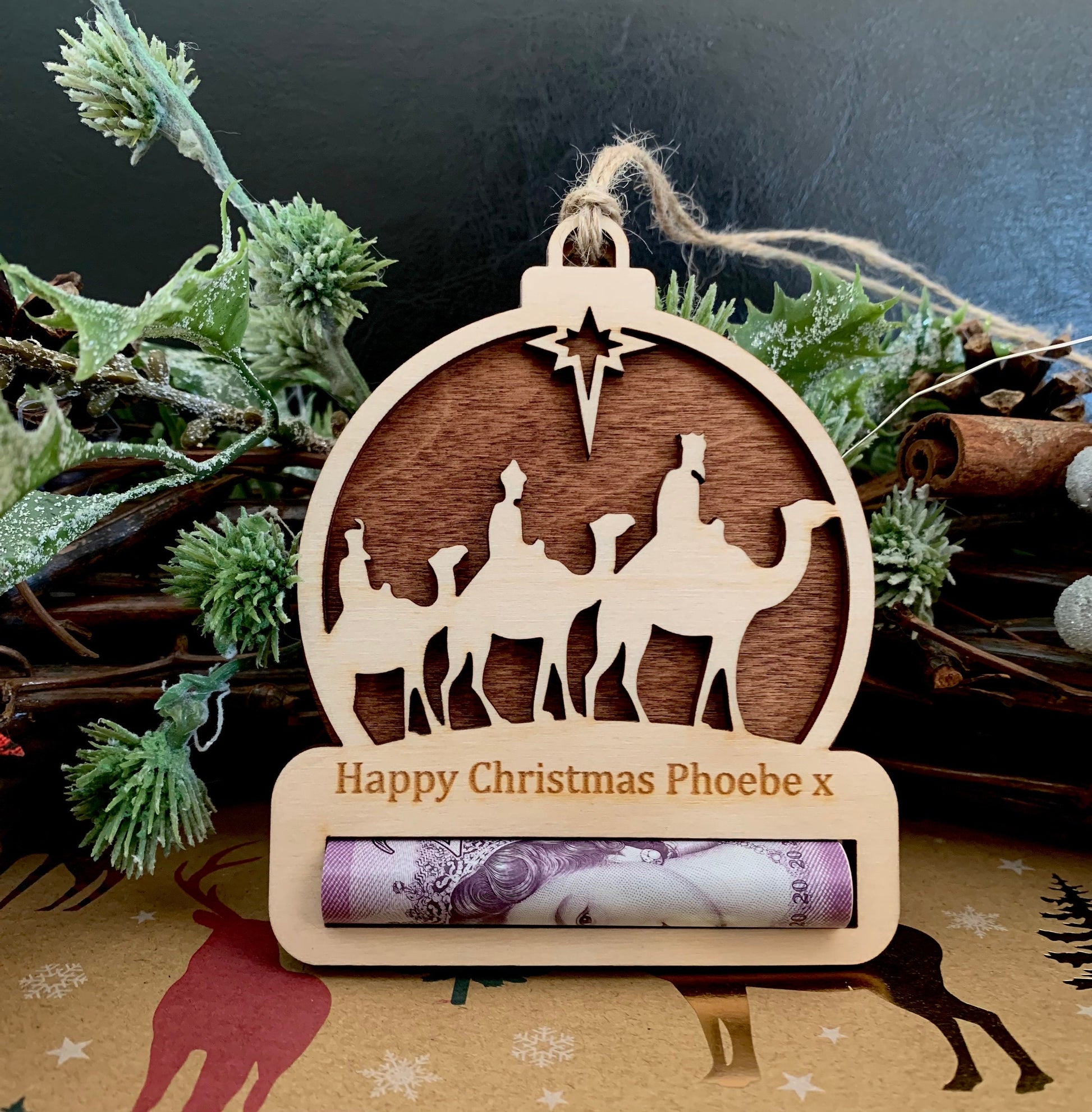 Beautiful personalised nativity wise men traditional Christmas tree money holder envelope bauble.