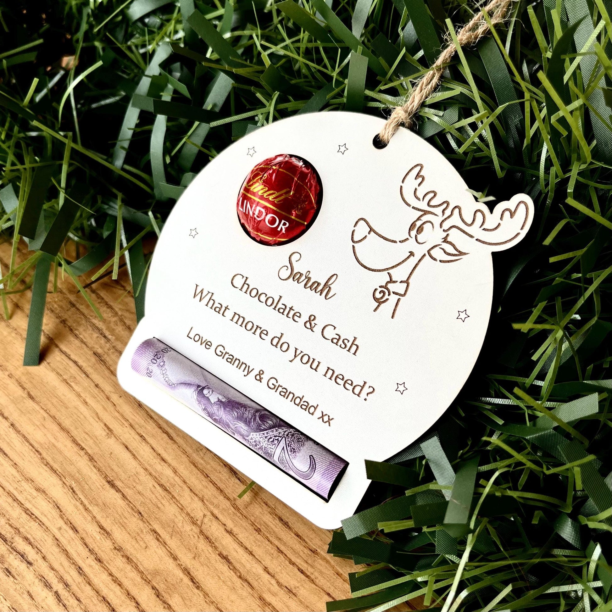 Personalised Reindeer Chocolate & Money Holder: Christmas Tree Decoration, Cash Envelope